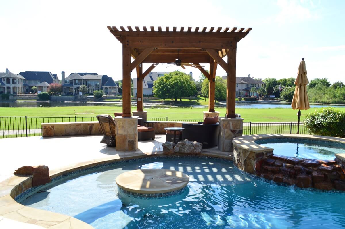 Of course, it wouldn’t be a typical Archadeck of NE Dallas-Southlake project if we didn’t include backyard amenities updates, and that we did! As with the front of this classic brick home, the backyard was well-appointed but required resuscitation. We built a stand-out custom cedar pergola, which we stained dark walnut, in perfect contrast with lighter stone elements surrounding it. The pergola boasts standard 8”x 8” posts and beautiful chopped stone columns with flagstone tops. The same materials were used to build the seating wall on the exterior of the pergola, which will not only provide seating but also a bit of privacy. Decorative hardware provides the perfect ornamentation on the rustic-looking cedar. The pergola also has an oversized ceiling fan for maximum airflow on hot days!