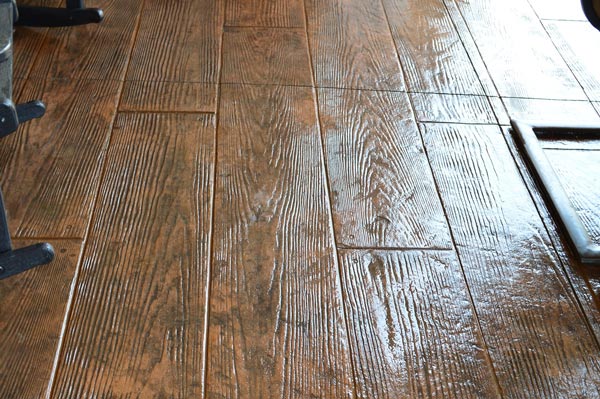 The inspiration for this beautiful, stain-and-stamp “wood-like” concrete flooring was ceramic tile patterned with a wood-grain appearance that decorators have used in recent years for interior flooring. Ceramic is great for kitchens and other indoor rooms, but concrete will perform better outdoors. It’s a trend with a twist!