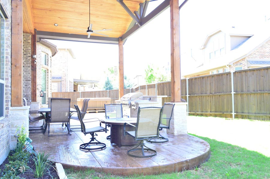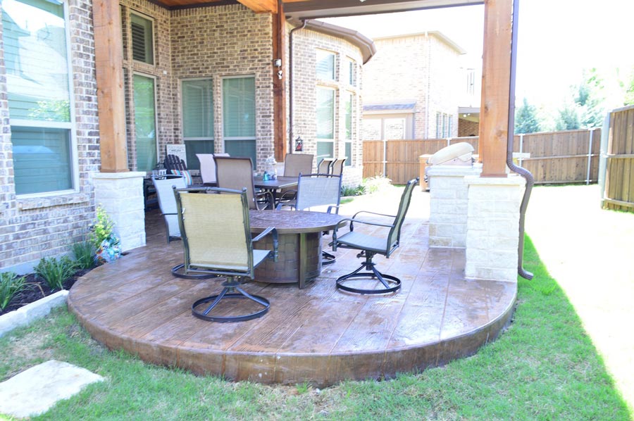 If you take a close look at the flooring pictured in this photo, you may think you’re looking at vintage hardwood floors. Not so! This is actually a stain-and-stamp creation that forms the base for this Grapevine, TX, covered patio. Yes, it’s a patio! The wood deck stamp pattern was designed to mimic the look of hardwood floors that have developed character over time. The stain color we used was Maplewood with a charcoal release.