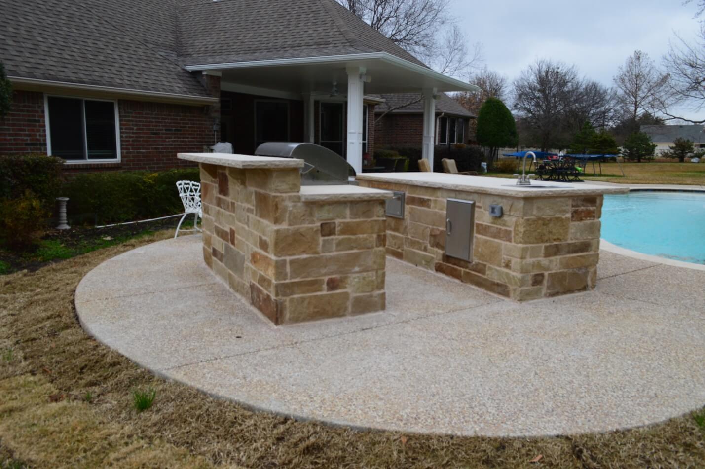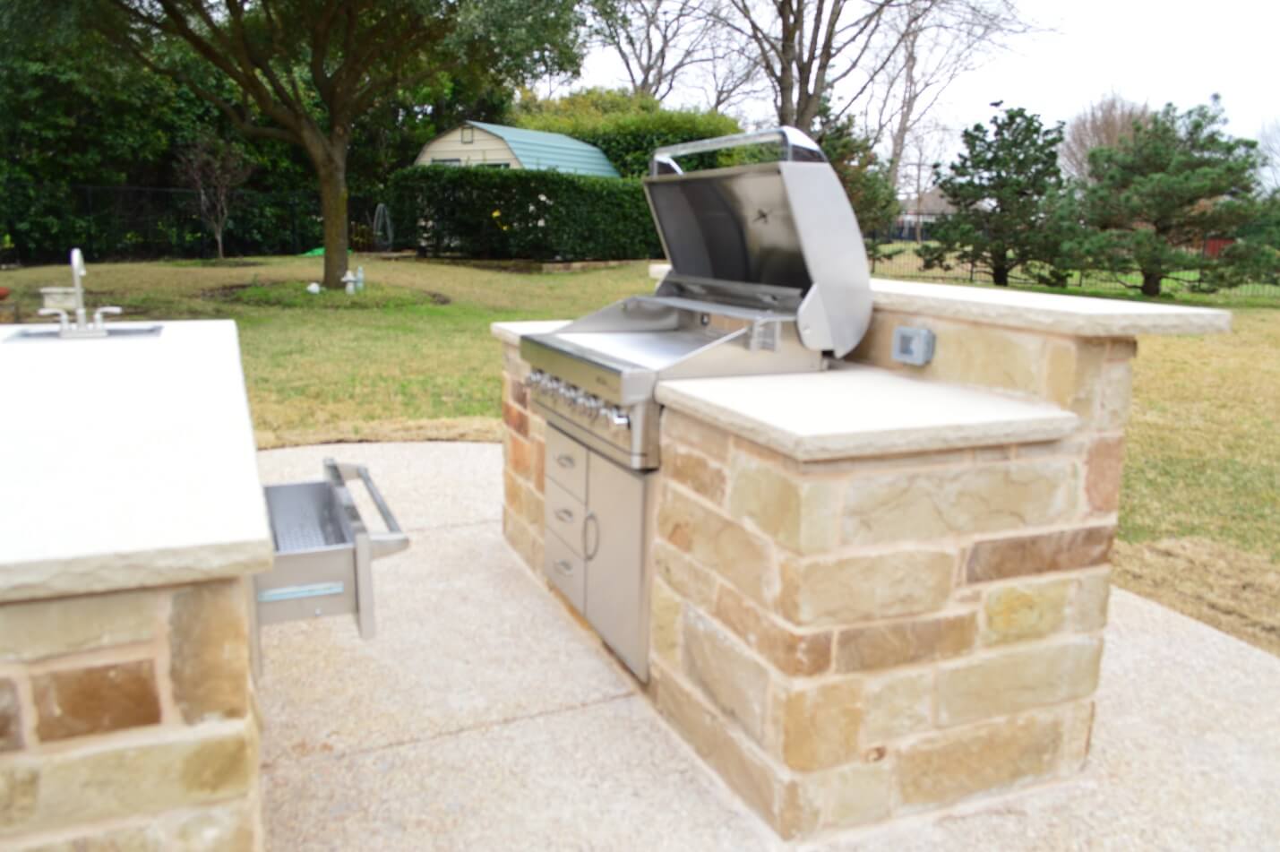 We expanded the existing aggregate patio, and gave it a very important functional upgrade – a custom outdoor kitchen! Like many of our clients before them, this family wished for better outdoor cooking accommodations. We gave them a custom kitchen with five burners, a sink, and a warming drawer.