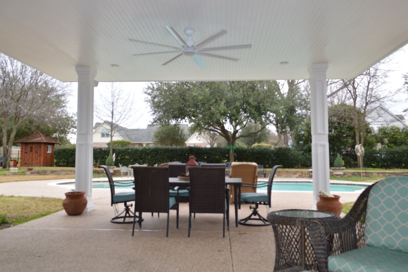 The interior of the patio cover boasts a hand-applied pine tongue and groove finished ceiling, also painted white, offering a clean and bright aesthetic. The finished ceiling allowed for installation of a large ceiling fan, recessed lighting as well as electrical for lighting on the cedar posts.