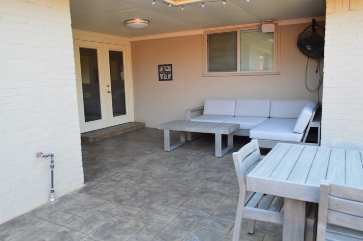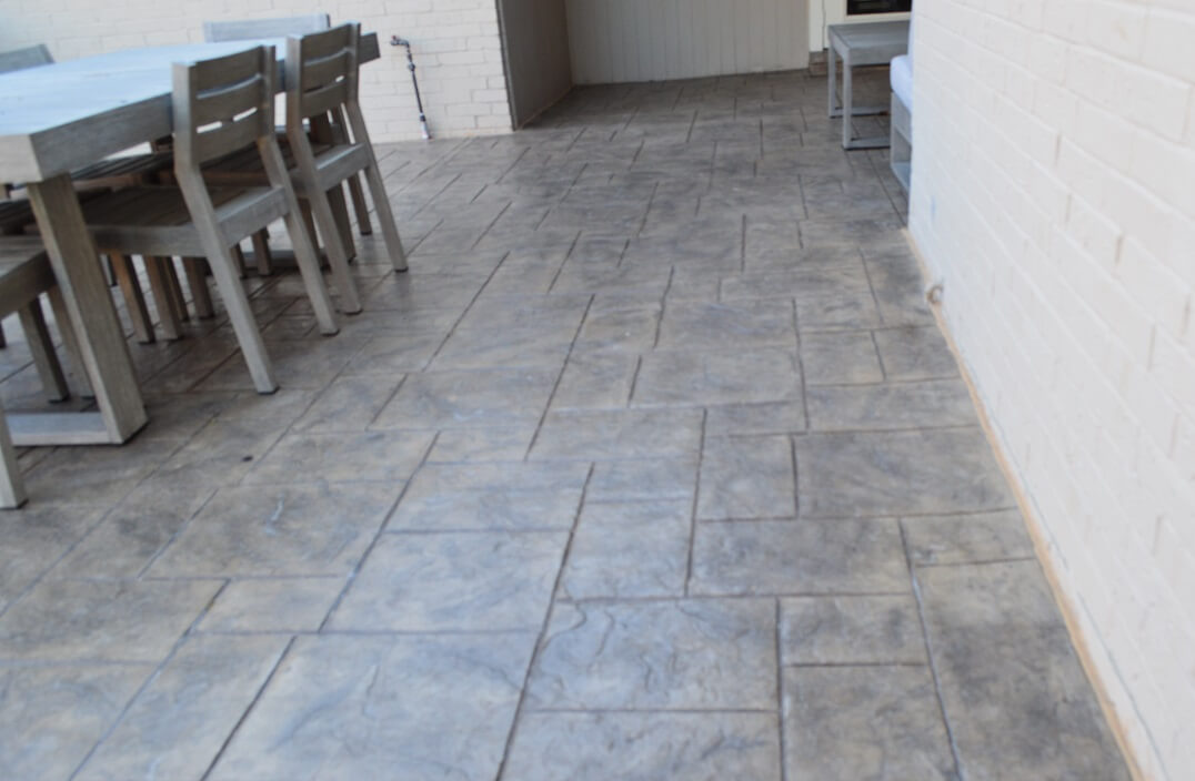 To reconcile the disjointed feel of the two distinct spaces for this family, we poured a brand new stain and stamp patio and did an overlay on the existing covered patio. We stamped the entire concrete patio with an ashlar slate stamp and Roman slate texture and applied an autumn brown stain with a charcoal release.