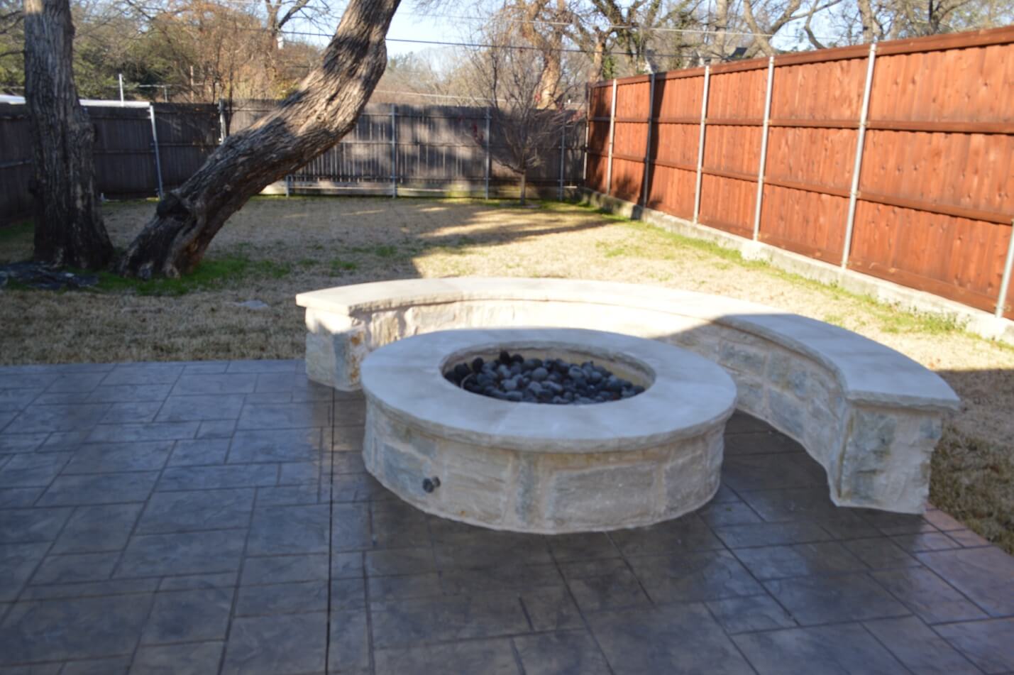 The fire pit and seat wall surround were constructed with Granbury gray chopped stone, and the tops are capped with gray Lueders stone. The earthen colors of the fire pit work in beautiful color harmony with the exterior of the home, as well as the new patio.