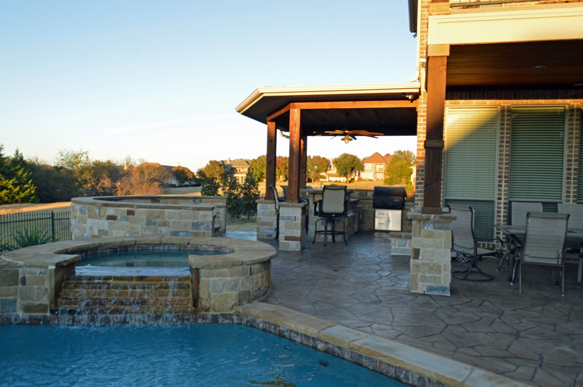 Heath, TX, Combination Covered Patio, Outdoor Kitchen, Custom Fire Pit, Waterfall, Pool Improvements, Landscaping and Fence