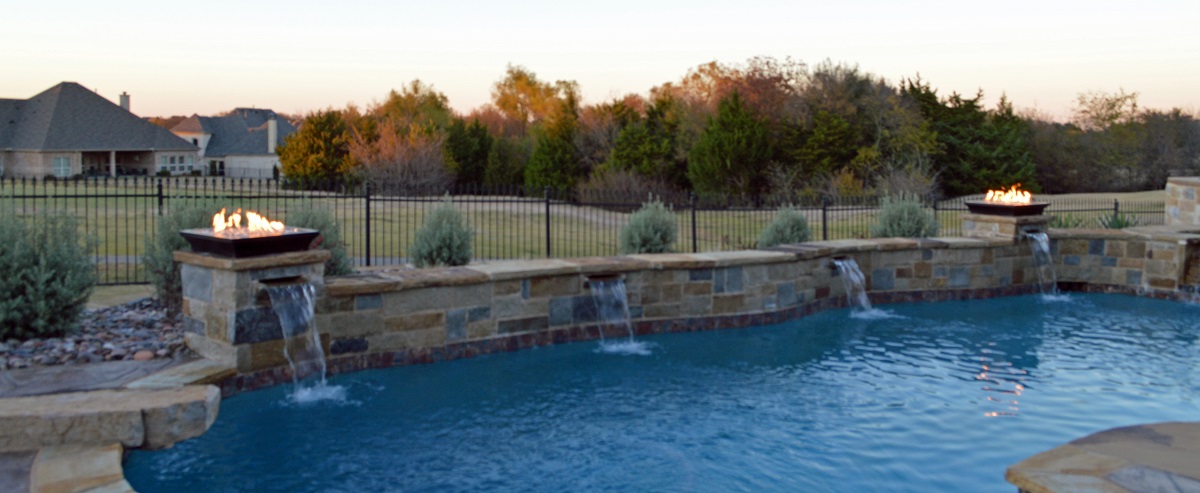 In this elaborate combination project, you can see that if you have a pool but don’t love the hardscape surrounding it, Archadeck of Northeast Dallas-Southlake can change that for you! We completely redesigned the hardscape for these clients in Heath, TX. Instead of looking at boulders, they now gaze at waterfalls and fire bowls around their pool. This project features the rich beauty of Lueders stone.