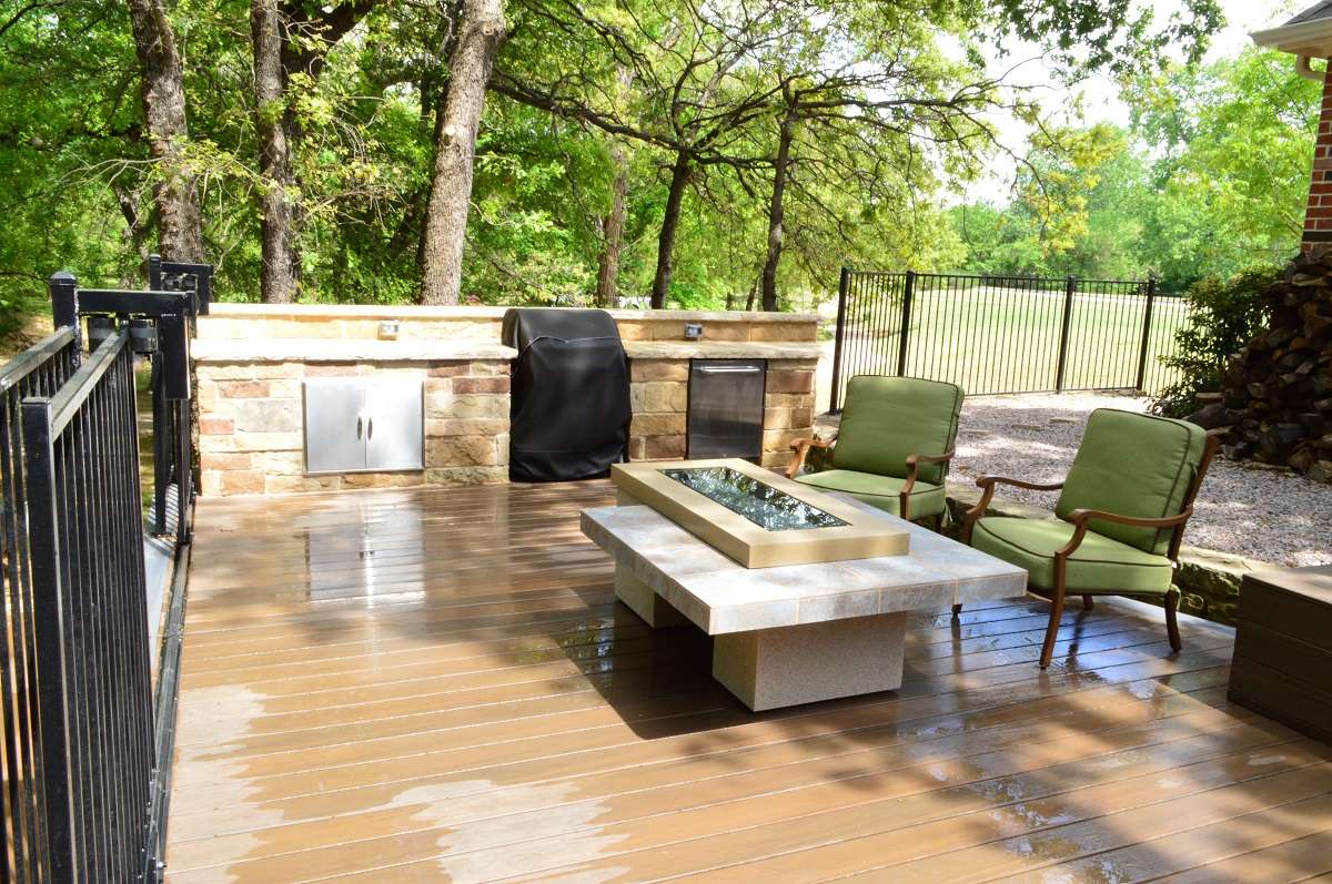 These Southlake, TX, homeowners called on deck builder Archadeck of Northeast Dallas-Southlake to design and build an elaborate deck and outdoor kitchen adjacent to their pool. Our design included a bi-level deck with Fortress low-maintenance composite decking impervious to moisture. The deck offers areas for preparing food, dining, lounging and gazing into the homeowners’ hypnotic fire table.
