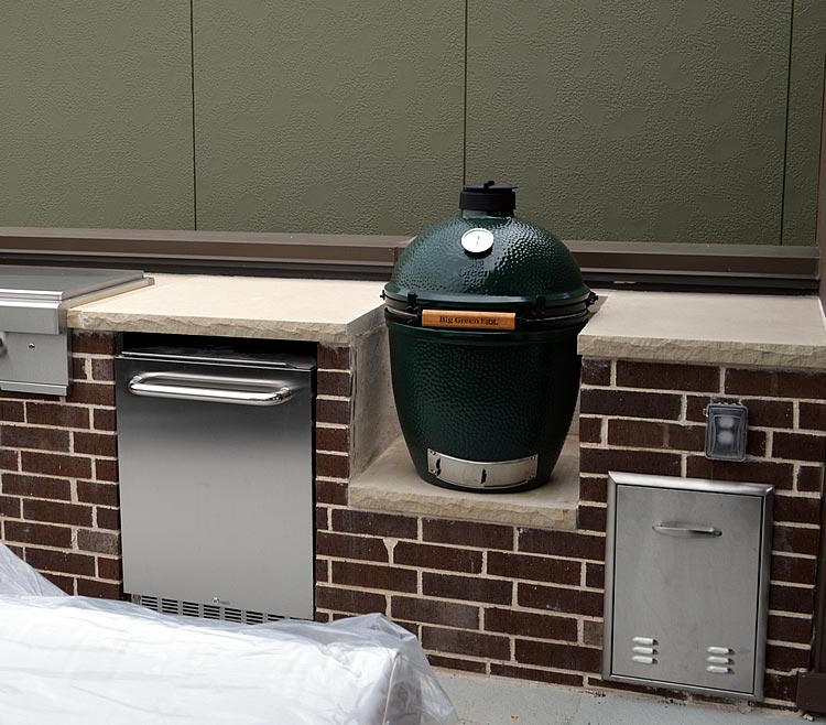 What this outdoor kitchen design isn’t missing, is electrical outlets and gas lines for grilling and cooking on the cook-top. And, of course, what Dallas TX outdoor kitchen is complete without a Big Green Egg? We can almost smell the ribs and brisket! In addition to cooking, smoking, and grilling accommodations, this kitchen has ample storage and stainless accent doors.