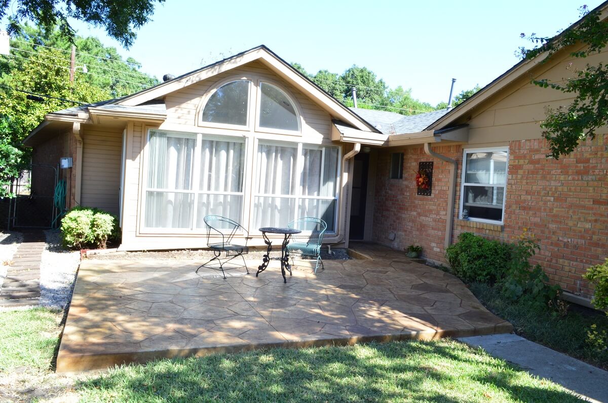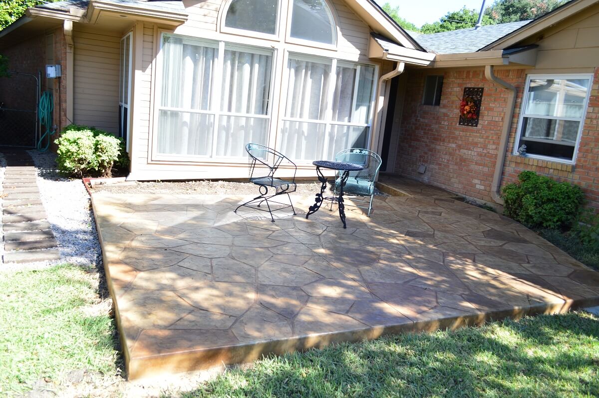 We created an open and inviting outdoor oasis through this stain and stamp concrete patio. The patio was built using a flagstone pattern with earth tones of pecan tan, sand and pecan tumbleweed. Archadeck also added a crushed granite path just to the left of the patio. We then installed the homeowner’s existing stepping stones atop the crushed granite to eliminate standing water and drainage.