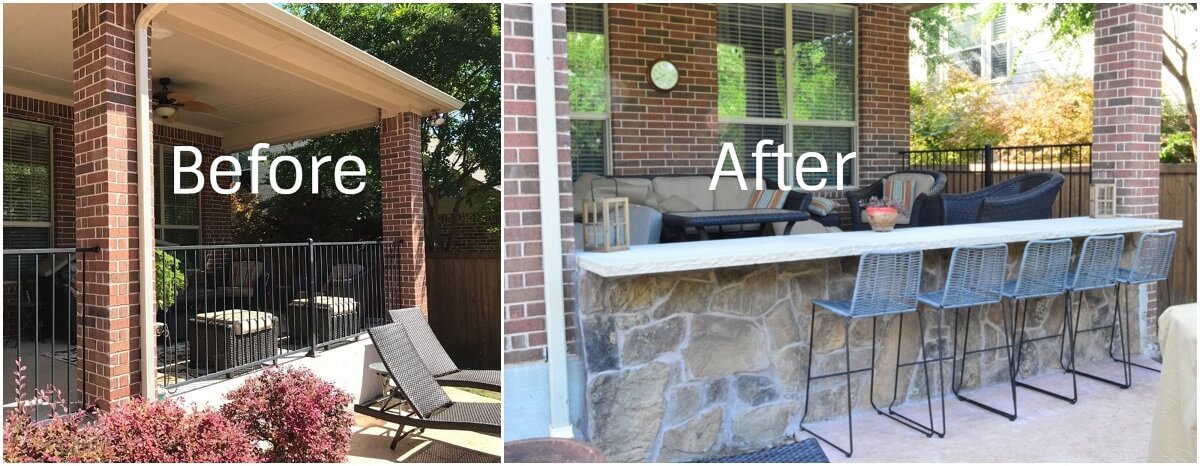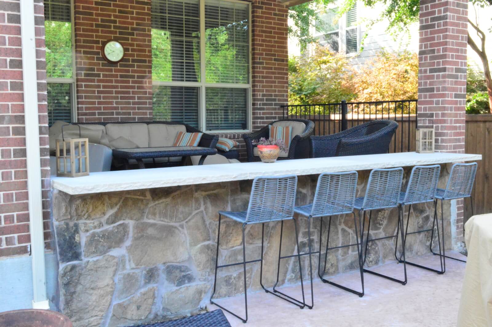 We stepped up the existing covered patio design by stepping it down. That’s right! Archadeck of Northeast Dallas-Southlake eliminated the railing on the left portion of the covered patio to open up the view. We then installed a versatile and crowd-friendly serving/seat bar that easily accommodates five (or more) stools. We used Autumn blend chopped stone for the base of the bar and topped it off with a gray Lueder’s stone top.