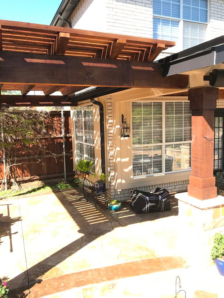 The pergola is also built using Cedar and the design is beefier than a traditional, run-of-the-mill pergola. We stained the pergola in dark Walnut to match the posts used on the patio cover.