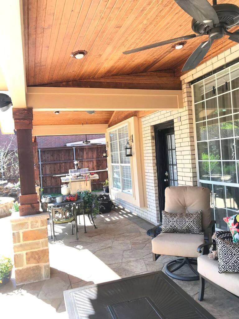 On the interior of the patio cover, we used a beautiful pine tongue and groove ceiling. The ceiling is stained in dark Walnut to give it a rustic appeal. We also stained the cedar posts in extra dark Walnut. We also included all the creature comforts you would expect in one of our custom designs… these include two ceiling fans, recessed can lighting and six speakers.