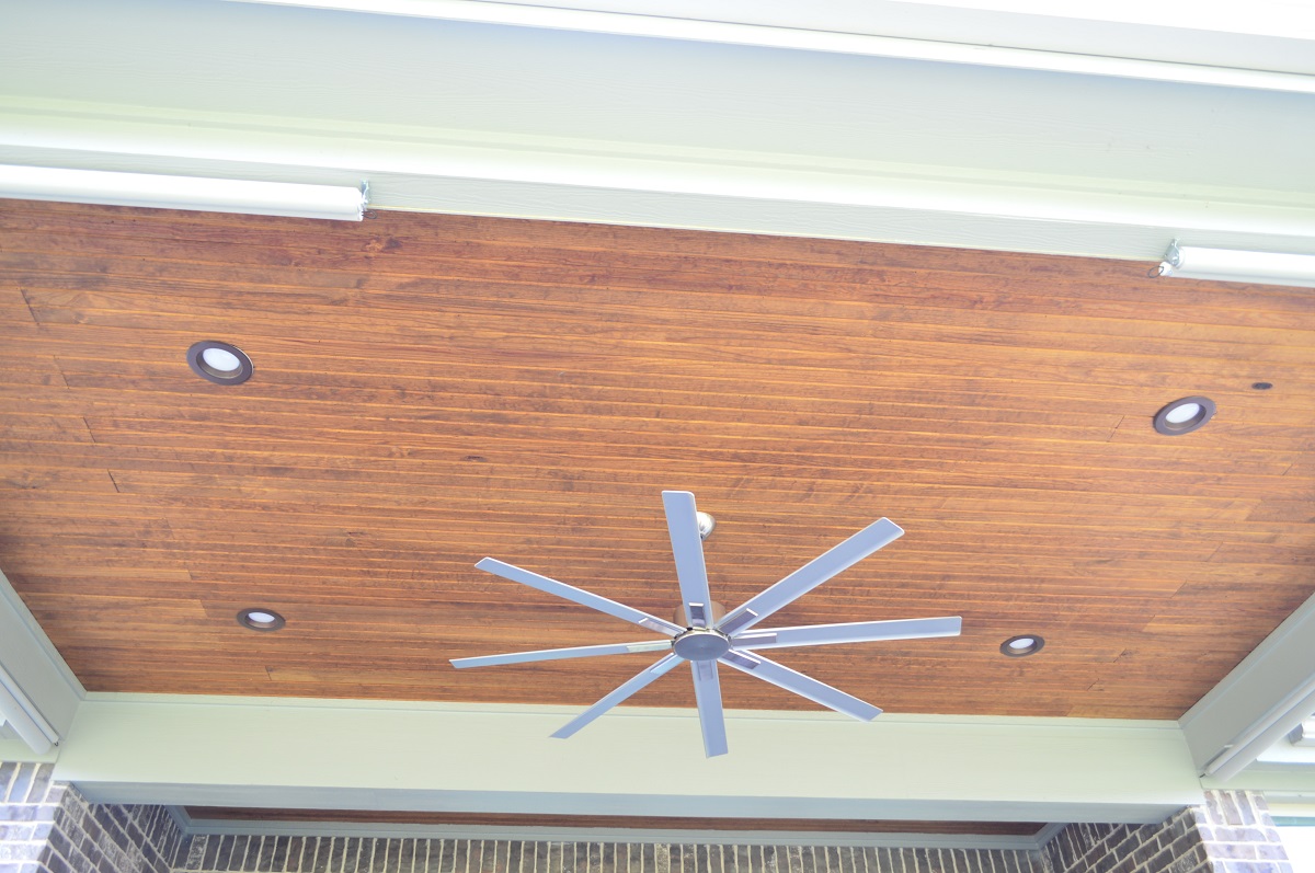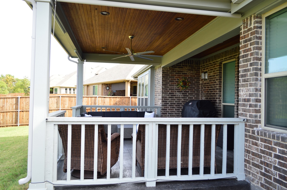 Next, look up! For the ceiling of this covered porch, the homeowners chose tongue and groove wood construction. It’s a beautiful selection and contributes to the refined, “finished” look and feel of this outdoor room. To make the old and new areas cohesive, we replaced the original Hardie board ceiling with the same tongue and groove wood in the new section. Creature comforts built into the ceiling include four recessed can lights and a ceiling fan. No Wylie TX covered porch or patio would be complete without a ceiling fan!