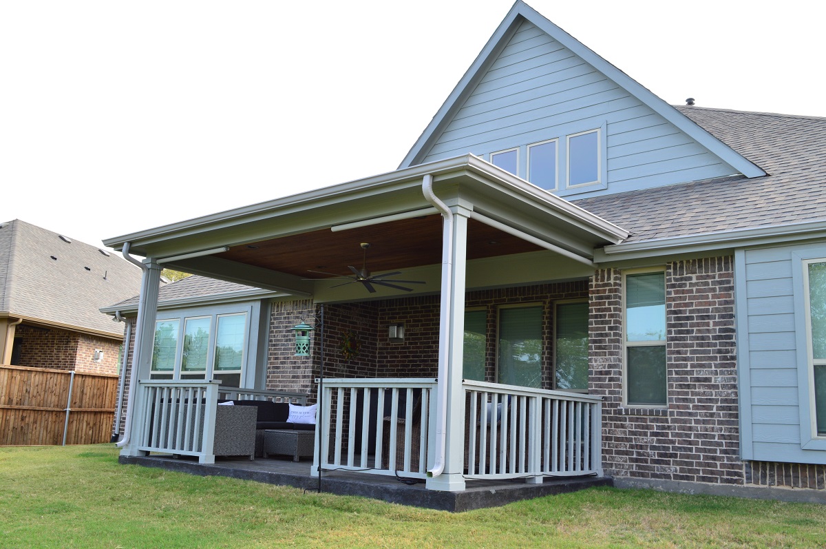 We predict that this sweet covered patio will quickly become the family’s favorite room “in” the house. It probably already has! How many people can say, “my favorite room in the house is outside”? That’s exactly what this Wylie TX covered patio is—an outdoor room. You can tell by the way it’s furnished that the family will enjoy this room like they would an indoor den or living room. That’s exactly what they wanted: an outdoor living room where they can relax and enjoy fresh air while protected from rain and direct sunlight.