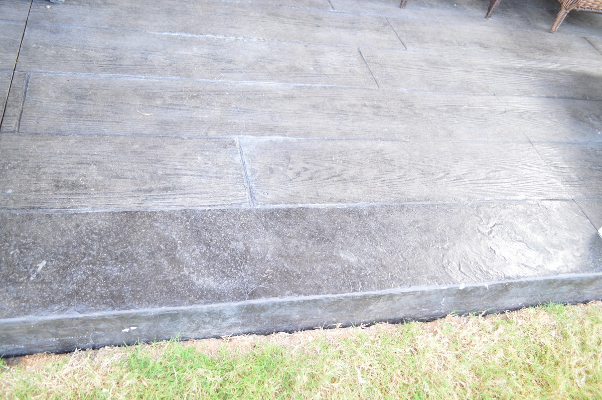 We extended the concrete patio floor to match the roof extension in size. Then we applied a stain and stamp overlay to the entire patio surface, unifying the original patio area and the new portion. Take a close look, because this patio floor is a work of art. The clients chose a stamp in the pattern of wooden boards with a 12" border and the stain color is winter grey with a charcoal release. Gorgeous!
