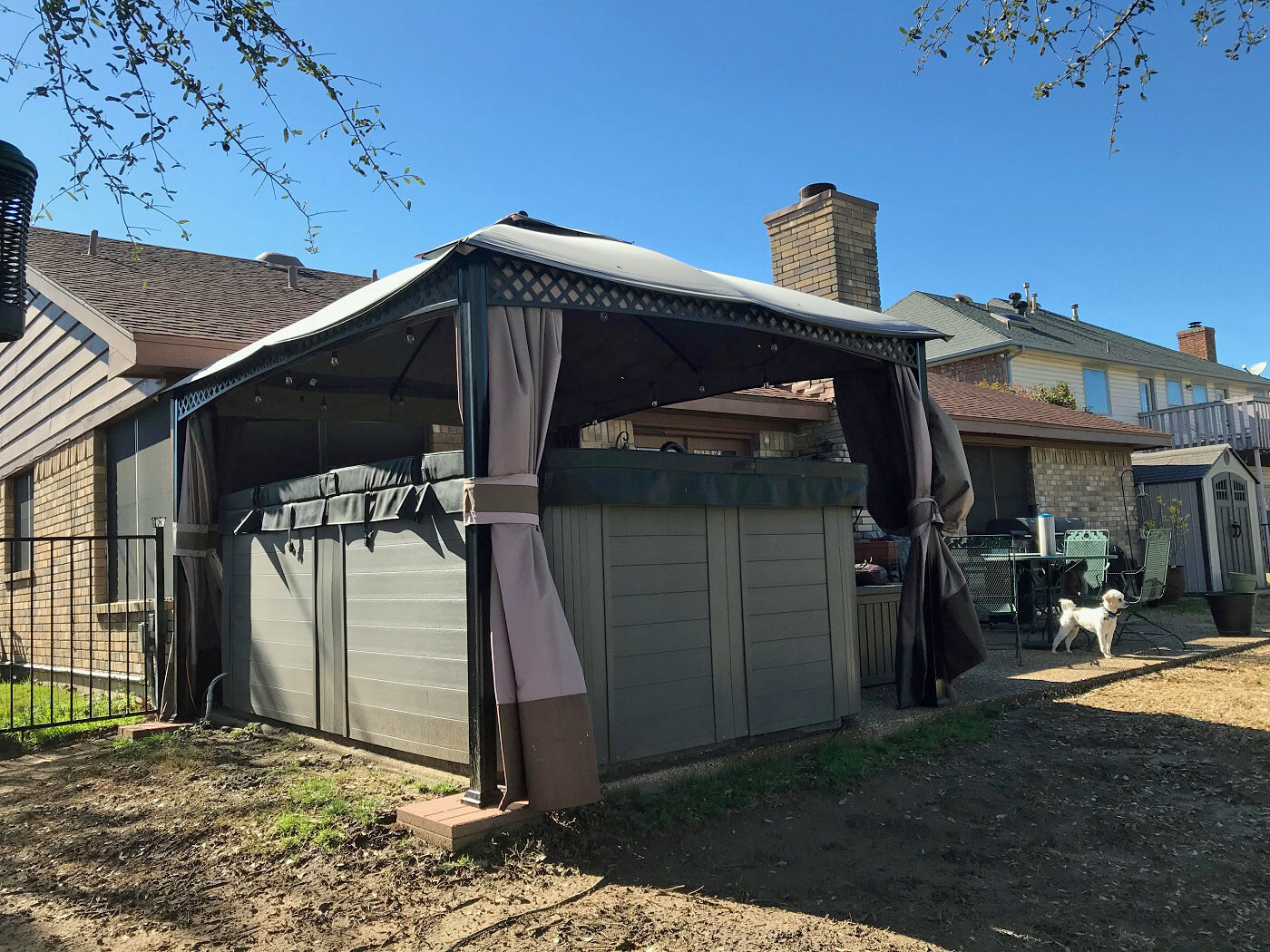 This homeowner enjoys the luxury of a home that backs up to a beautiful golf course. She also enjoys the luxury of a swim spa on her back patio, and she uses it every day. What she didn’t enjoy were the mosquitoes that tormented her when she went outdoors to swim or relax on the patio. In addition, the canopy over her swim spa provided a bit of shade, but the area became hot and stifling at times.