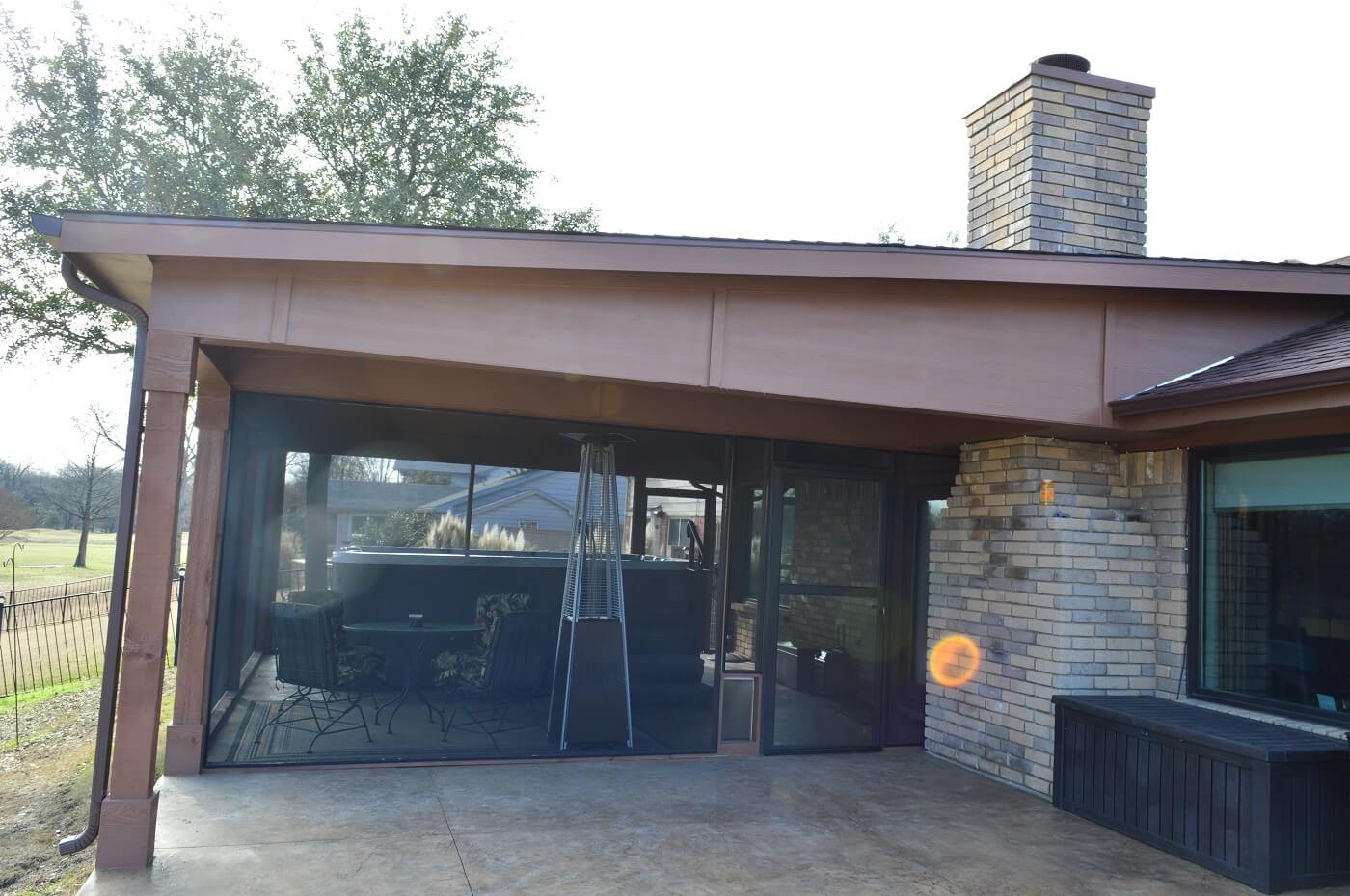 There’s plenty of room in the new screened porch. While the canopy was confined and only had room for the spa, the screened porch can accommodate a table and chairs as well. The porch includes two PCA aluminum screened doors for easy access to and from the space on either side.