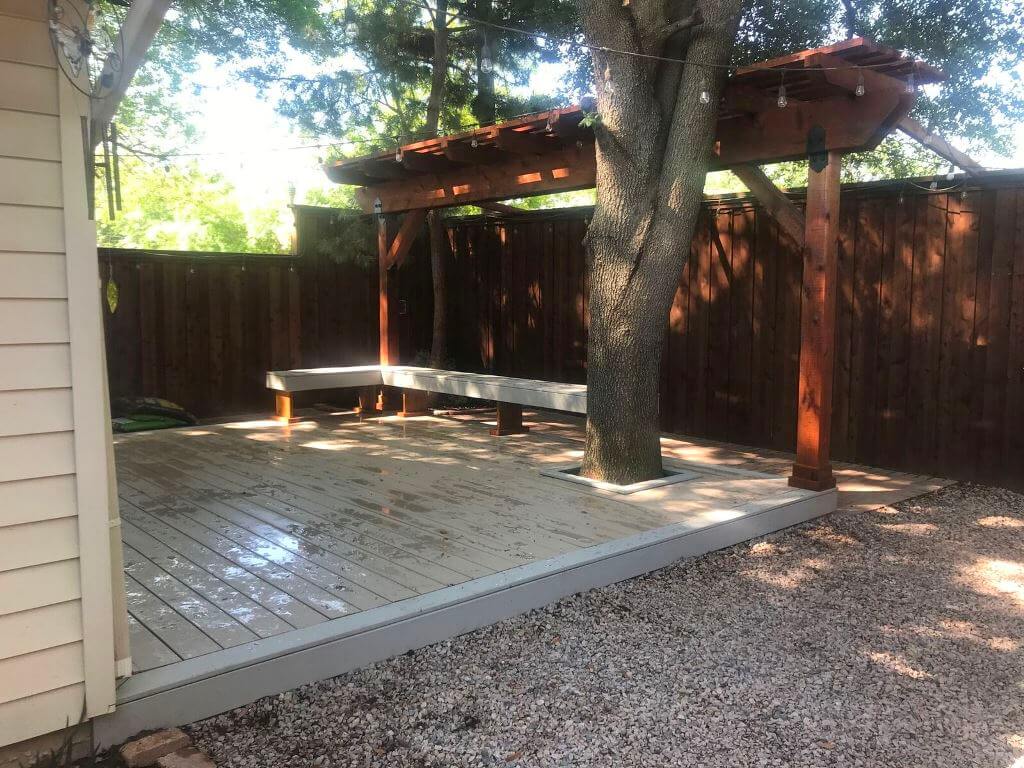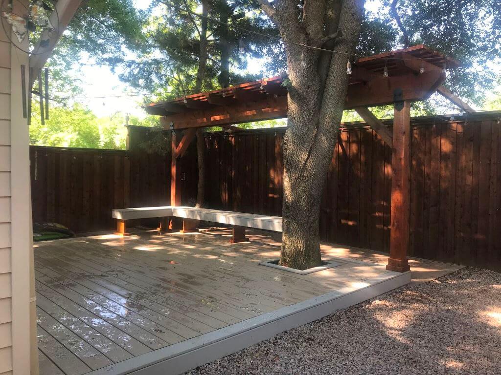 Notice how Archadeck of NE-Dallas-Southlake was able to integrate the oak tree into the actual deck design leaving enough room for future growth so as to compromise the health of the tree (or the deck). The custom bench seating you see on the deck was built using the same TimberTech decking as was used on the deck itself. This little extra adds depth to the design and additional seating without having to add more furnishings.