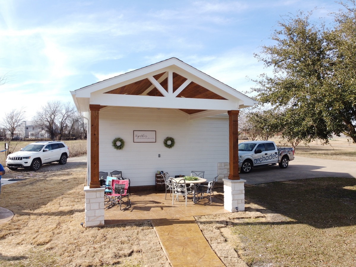 Archadeck of Northeast Dallas-Southlake built the charming, farmhouse inspired detached garage using a gable roof design. Not only does the garage keep automobiles and other items out of site, it also features a walk-out covered patio area. Cedar posts and a lovely stain and stamp patio stained in pecan tan make this a perfect gathering spot for entertaining family and friends visiting from out of town. The columns feature chopped stone coping at the bottom to match the interior ceiling of the covered patio.