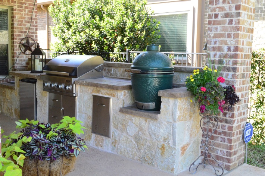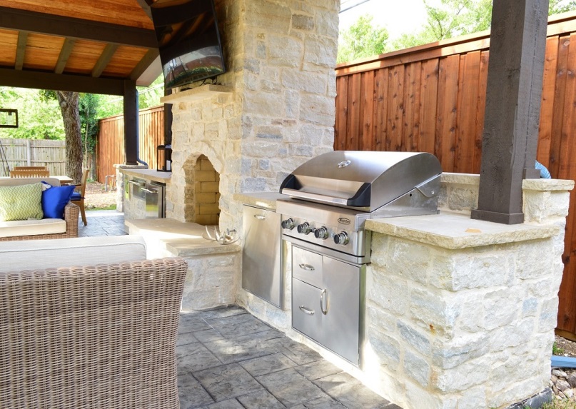 Many homeowners’ first concern is choosing the material for their outdoor kitchen countertop. The countertop is important both aesthetically and functionally. At Archadeck of Northeast Dallas-Southlake we recommend limestone countertops, including Texas’s own Lueders limestone. These limestone slabs for countertops come in several attractive shades of gray, charcoal and chocolate. Many clients ask us about quartz or granite countertops. We don’t recommend quartz or any other man-made materials for your outdoor countertops and backsplash because, over time, the sun will fade these dramatically. Granite is a beautiful upgrade but has a few drawbacks. It is expensive, requires polishing, and when in direct sunlight, it gets splotches and can heat up and burn you.