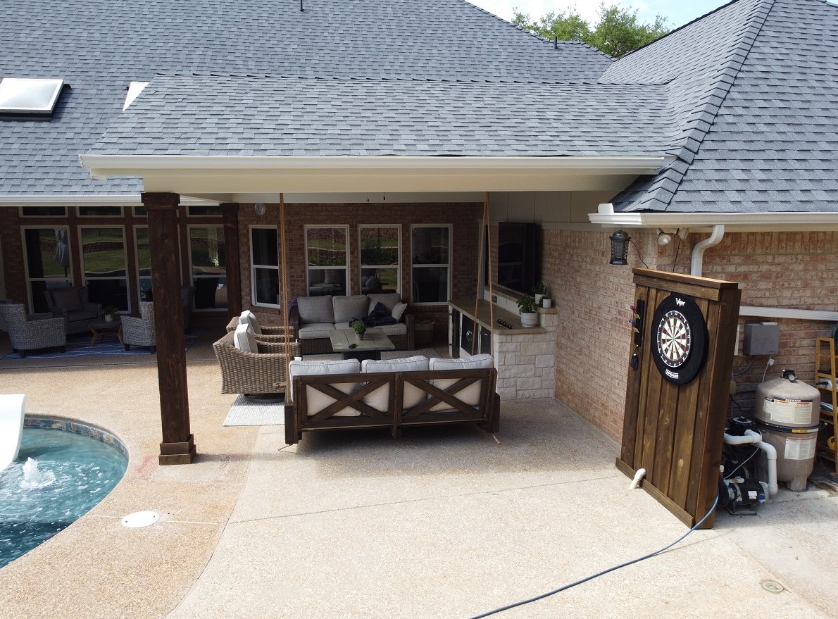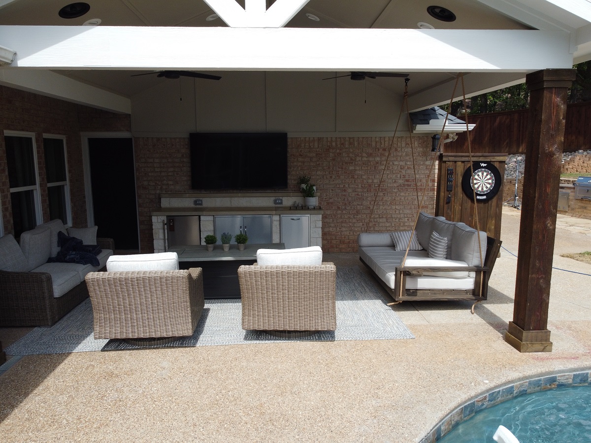 - Also within the covered patio is the new 9-foot bar whcih has a TV mounted overhead. We coordinated installation of speakers with the speaker company. They did the wiring when the ceiling finish was still open and then they came back out to finish the installation. Archadeck added plenty of lighting and multiple ceiling fans within the space.