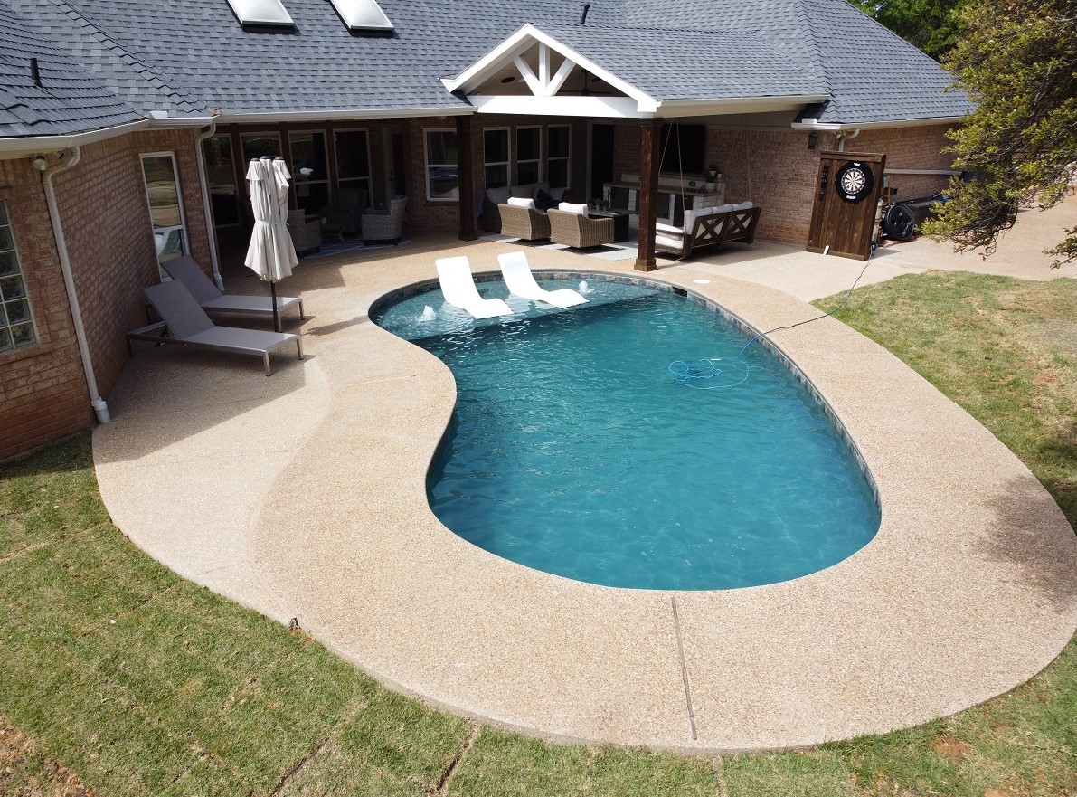 A new aggregate concrete area integrated into the existing pool surround. Notice how we created a custom niche to house the clients’ shade umbrella as part of the design – so custom!- A new channel drain was added between the new and old patio areas to ensure water drains properly.