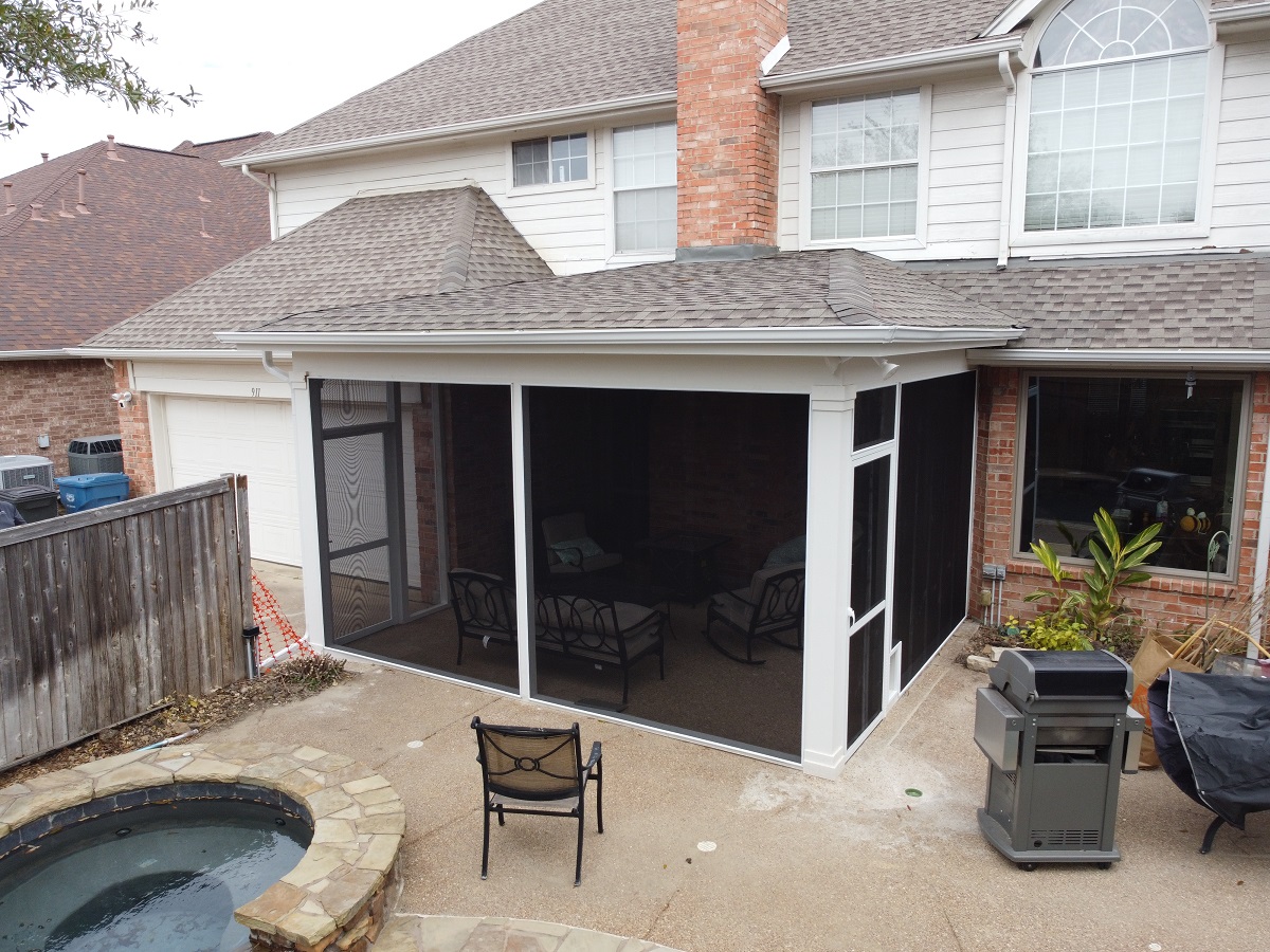 Once we had the patio cover structure in place, we then screened the entire area using our signature screening system, SCREENEZE®. This system is a patented , fixed screen system, featuring an aluminum base and a vinyl cap which are snapped together and attached to your porch. Screen clarity and the ability to span wider areas with no wrinkles are just a few of the reasons we recommend this system.
