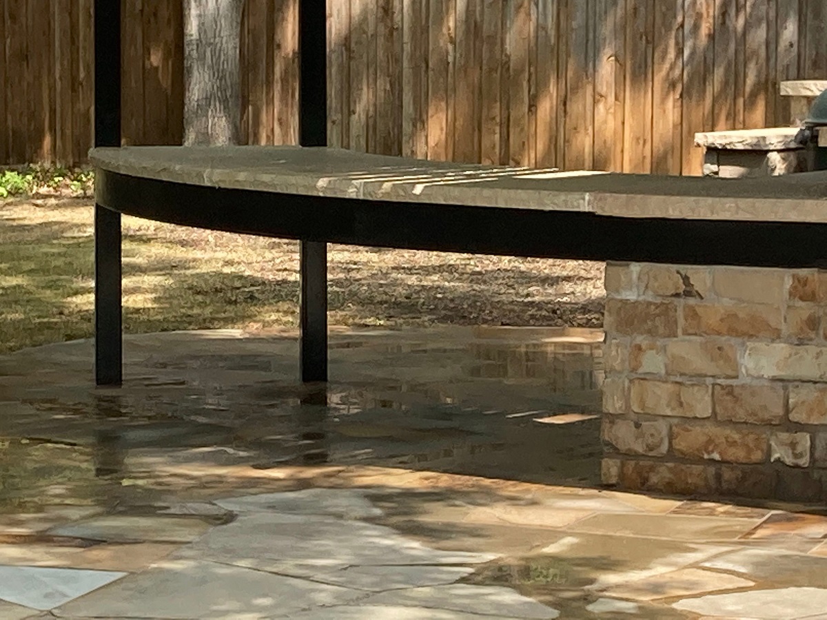 Once the patio base for the new outdoor kitchen was completed we then began work on the outdoor kitchen addition. The kitchen was built using a mix of 4”, 6” and 8” chopped Oklahoma stone. The design is flanked by a curved, steel-framed bar and trellis above. We worked with a welder on this project and the steel areas were all custom-welded with precision.
