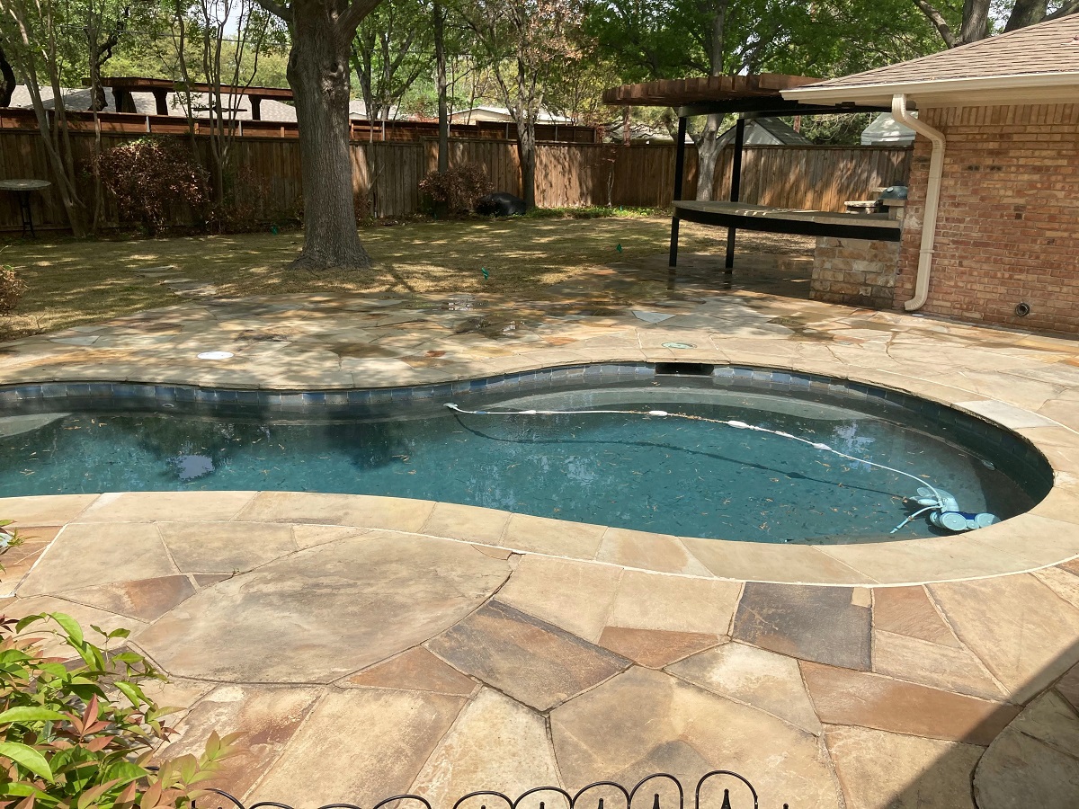 Archadeck added a flagstone patio extension which matches that of the existing pool surround. We also added that same flagstone to the area on the far end of the poolside which was a flagstone path.
