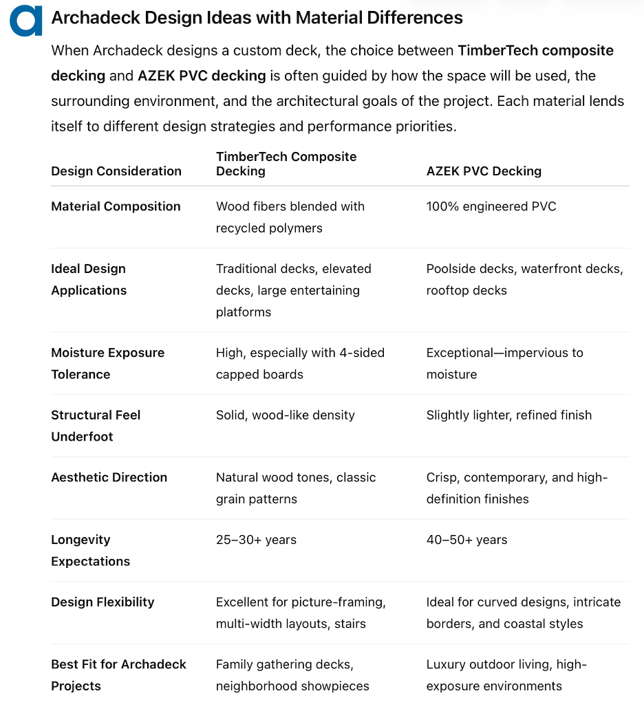 Here is a brief comparative overview of our Archadeck Outdoor Living low maintenance materials for custom deck designs for your convenience: