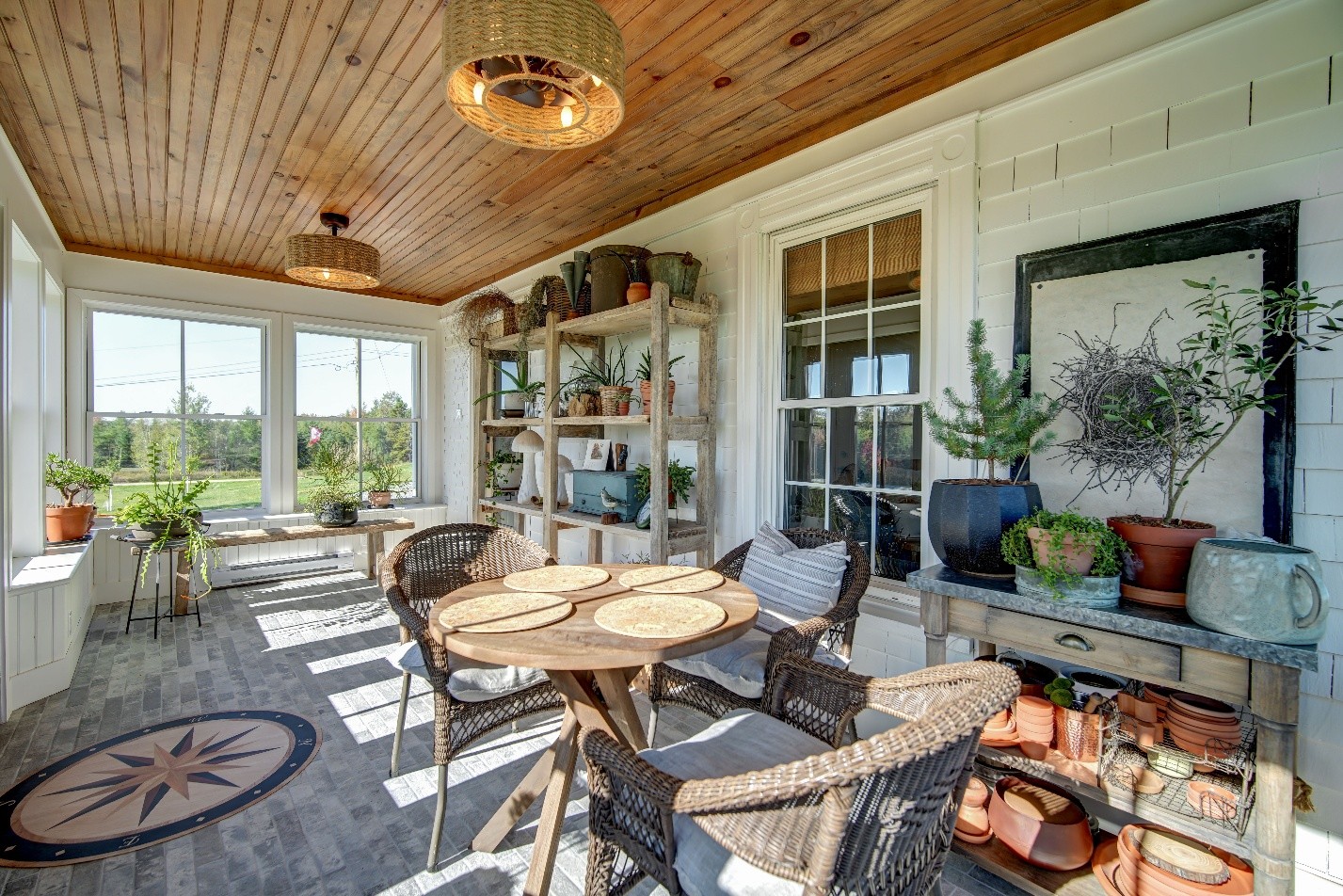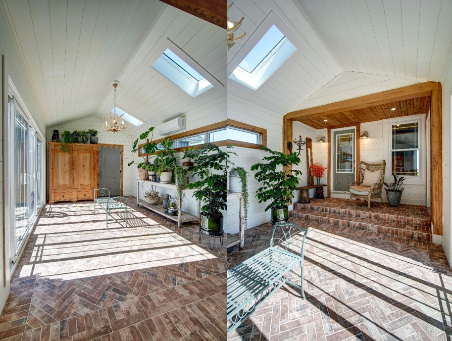 Moving inside, the craftsmanship truly came to life in the details. The new insulated breezeway serves as a stunning connector between the house and garage, featuring two large sliding patio doors that open onto a private courtyard. Overhead, skylights and a pine board ceiling create an airy, warm atmosphere. In the rebuilt front sunroom, we installed complex flooring tiles that required precise layout and cutting, complemented by pine board accents that echo the home’s farmhouse roots. Outside, the homeowners now enjoy a spacious stamped concrete patio surrounded by privacy fencing and garden beds, creating a perfect sanctuary for relaxation. The result is a property that not only functions better with ample storage and year-round living space but looks timeless in its setting.