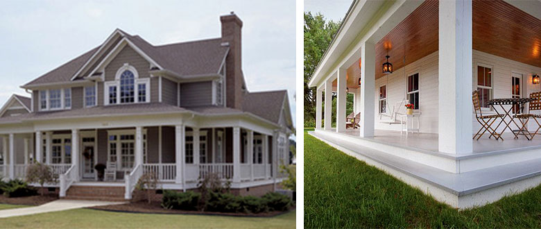 A Wrap-Around Porch or Veranda is a roofed platform along the outside of a home. It’s level with the ground floor and extends across both the front and side(s) of the structure. These expansive porches connect the inside living spaces with the surrounding landscape, making the whole home feel larger. With a wraparound, you have the space to create different zones for entertaining, lounging, and dining.