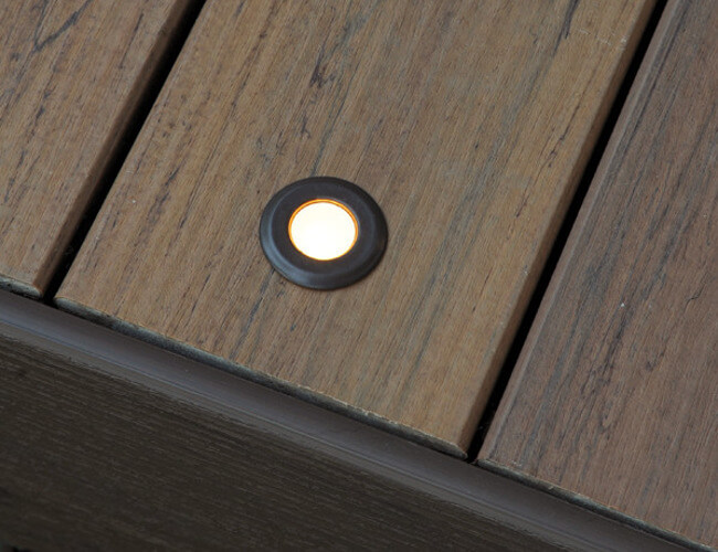 These are mounted flush with the deck surface. They create soft light and give an ambient up-glow. They’re great for marking the perimeter of the deck or highlighting different levels, especially when there are aren’t railings.