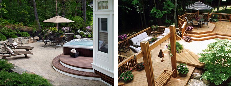 The finishes of your home should play a role in choosing the materials and finishes of your new deck or patio. For example, if you have a brick home, adding a brick patio would probably overwhelm the space. By breaking up lines and adding different, yet complimentary materials you add texture and visual interest. By continuing the same roof material over the new structure, or matching the deck skirting to the window frames of the home, you give the new project a cohesive look.