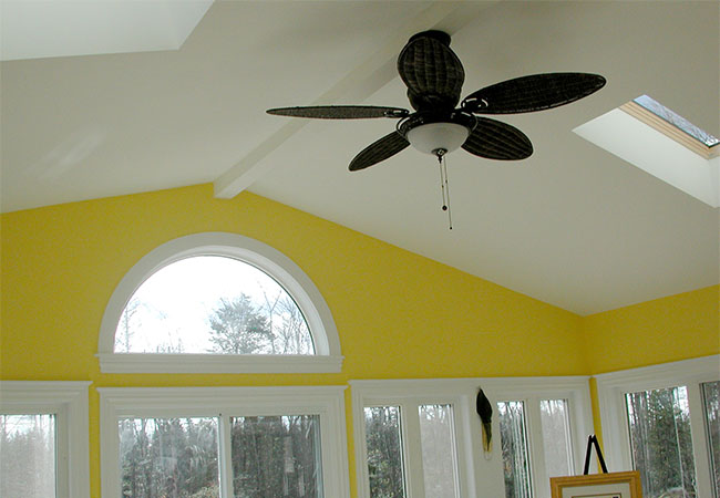 Yellow walls and crisp white trim keep this space bright and sunny even on grey winter days. The beautiful accent ceiling fan keeps the airflow moving on warm summer days when the sun is full strength.