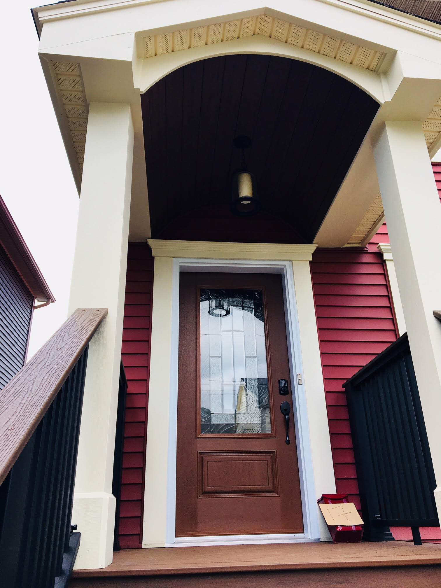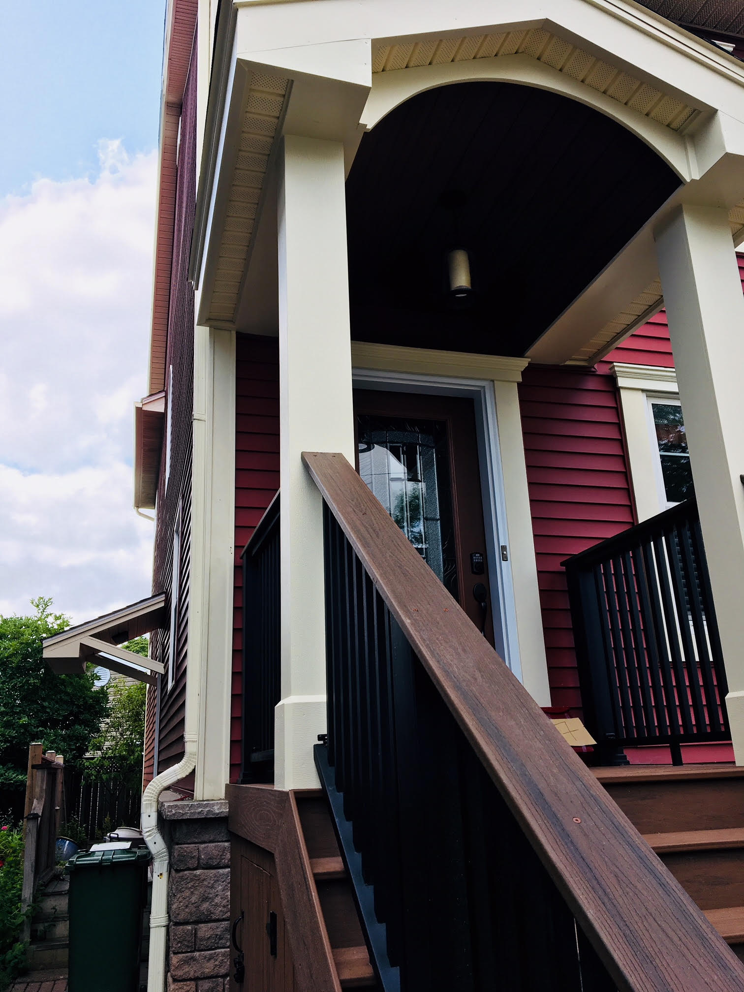 A new gable roof complete with asphalt shingles, arched composite ceiling, fascia and painted PVC clad support columns. We also, replace front entry door and expand existing exposed aggregate driveway as per design.