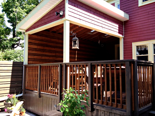 Incorporating a contemporary porch gave them a covered space to entertain and grill even in inclement weather. Skylights were added to allow plenty of natural light in. The new deck was given a two-tone stain in rich, earthy browns. The side wall was finished with horizontal rough-cut boards adding charm and warmth and giving the illusion of a larger space. They lead your eye to the privacy fence and patio below.
