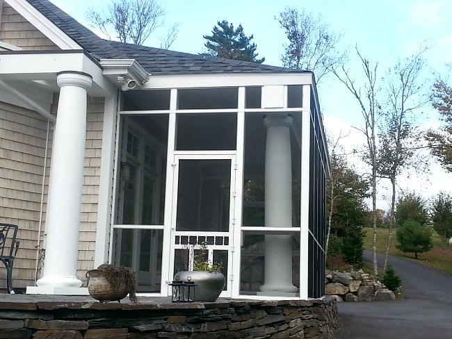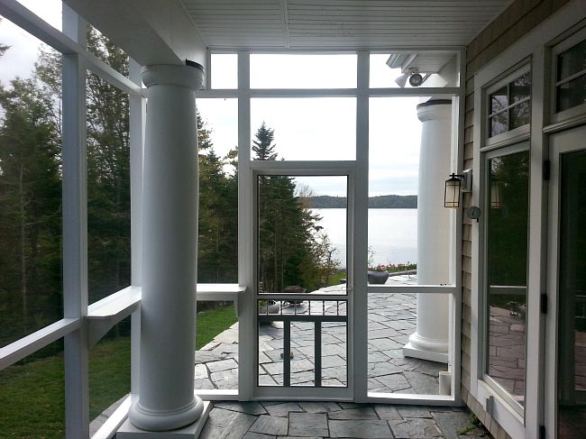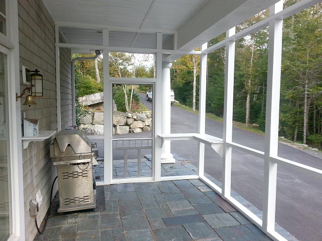 Patio stones in tones of blue were used to keep the overall feeling relaxed and pay homage to the nearby Atlantic Ocean. The high quality screen encloses the area and will stand up to the winds that blow off the water.