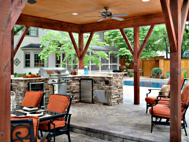 The natural stone interlocking bricks transition from the backdoor and pool area to a new covered porch and dining area.