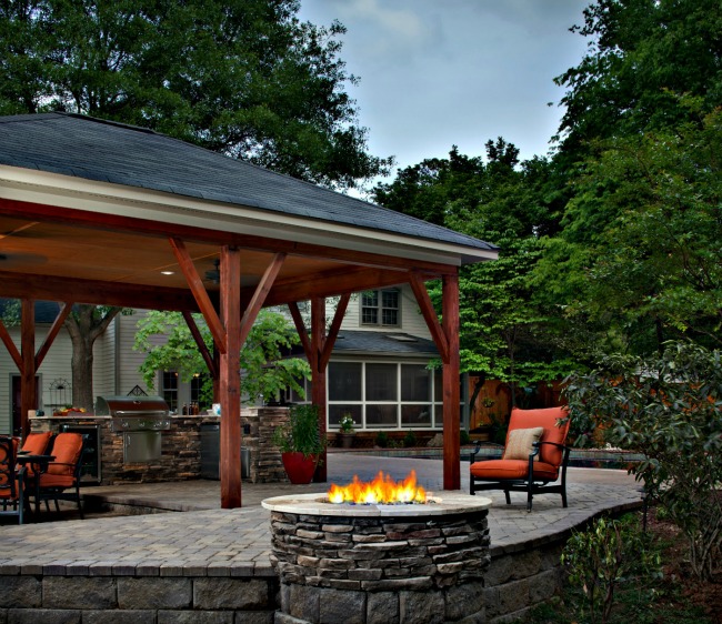 Beyond the covered porch, we incorporated a fire feature into the stone retaining wall. This family can now toast marshmallows anytime of year and get out to enjoy their outdoor living space, despite the weather.