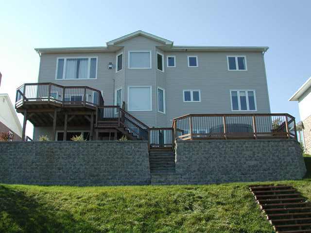 This hilly property in Dartmouth required a lot of stone work to make sure the deck above was not only beautiful, but stable and safe for years to come. We added a new multi-level pressure treated deck with sleek black aluminum railings and a staircase linking the front and the back of the home.