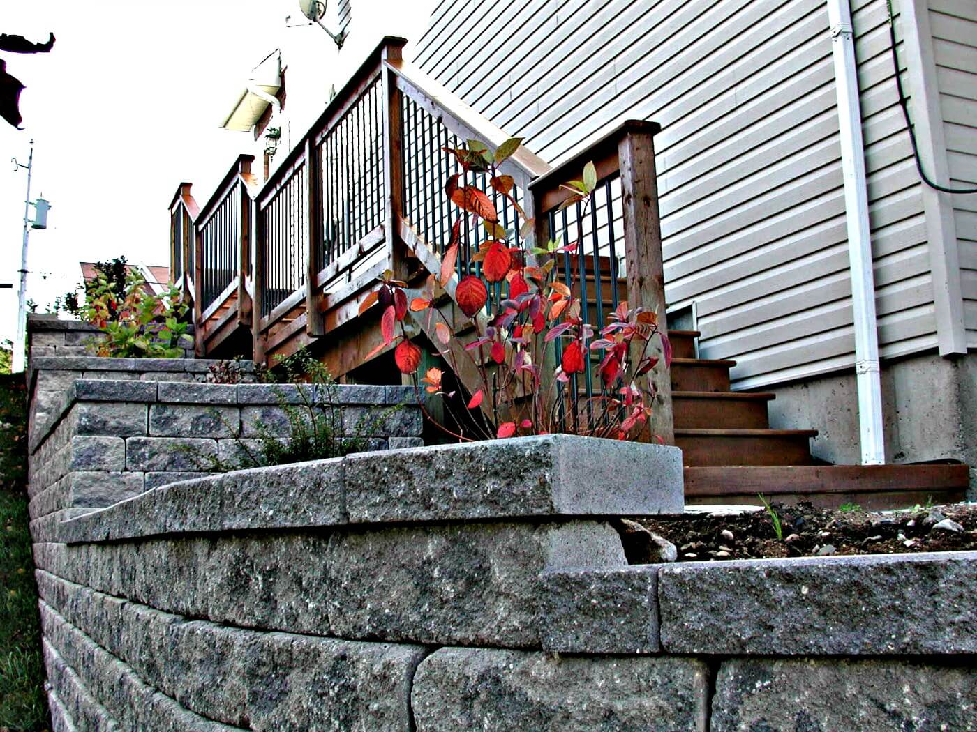 We carried the stone work up the side of the home along the stairs to stabilize the structure. Planters were incorporated along the staircase to enhance and soften the look.