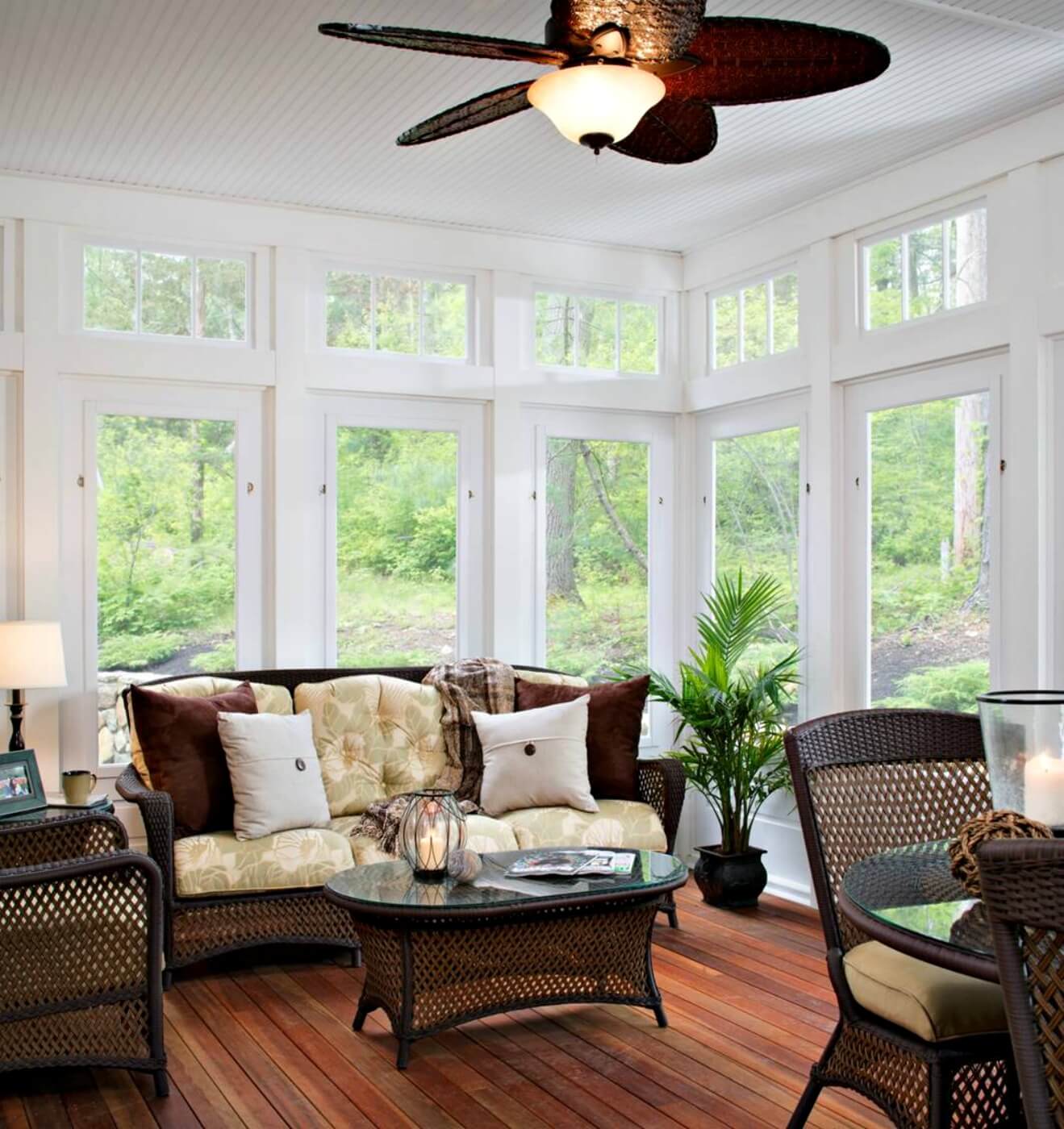 With 3 walls of large, white-trimmed windows, the natural light keeps this space bright and inviting throughout the seasons. The ceiling fan keeps the air flowing and the temperature consistent. From inside, you’re able to see the beautiful stone patio, hot tub, and wooded area beyond.