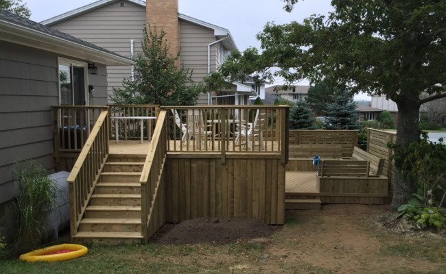 The multi-level, treated timber deck kept the grilling space close to the new dining room entrance. The in-deck lighting lets you get down to the lower levels in the evening with ease. These clients are avid gardeners, so built-in planter boxes were incorporated into the design. Benches with hinged storage covers create a comfortable seating area to entertain. Horizontal fencing panels add privacy as well as the surrounding greenery.