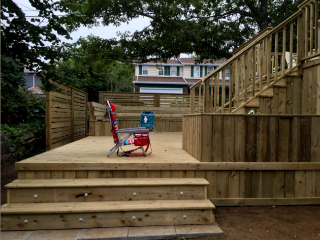 This client’s home, just outside of the Halifax Peninsula, was in need of an outside entertaining area. They only had a small, shady concrete slab and were looking to up their game. We presented a plan which added a new sliding door to their home, and used the east side of the lot for maximum sunshine.