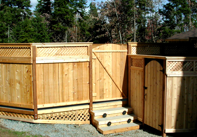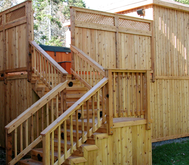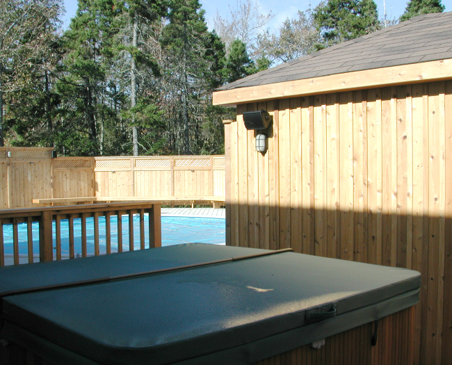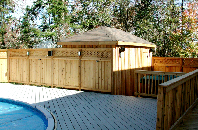 The deck railing, pool house and stairs are constructed of Western Red Cedar. The pool house contains a bathroom and changing room so there is no need to go inside.