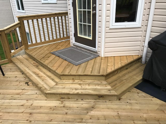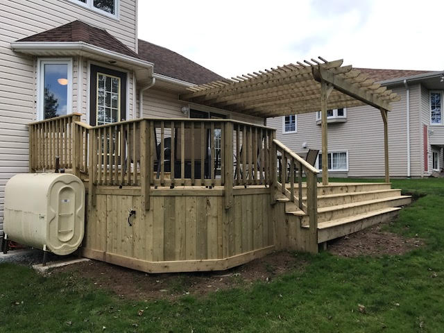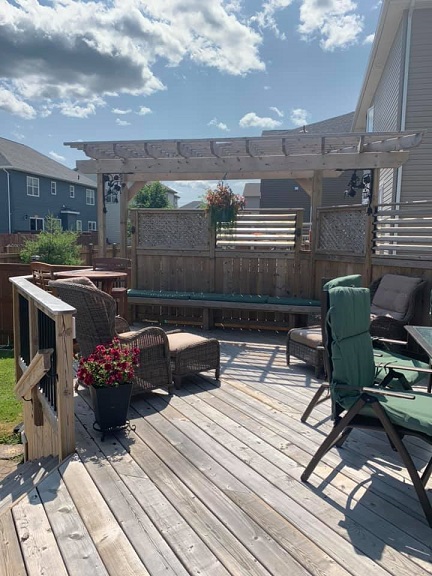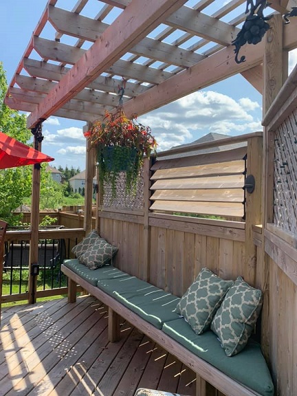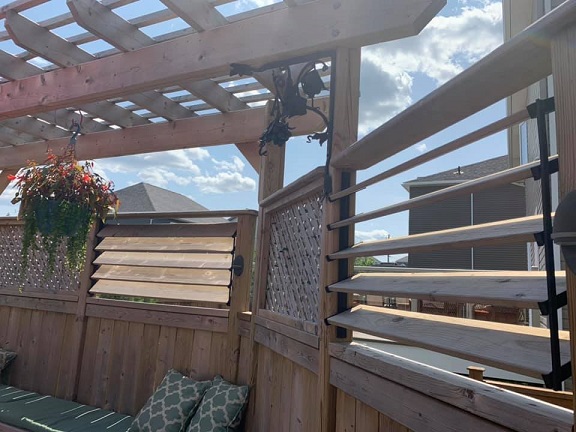 We supplied and installed a pressure treated two-level deck with stairs, railings with black aluminum balusters, privacy fence, pergola, bench seating, bar area and solid board skirting. The new privacy fence has a alternating lattice and adjustable louver detail integrated into the pergola shade structure.