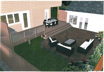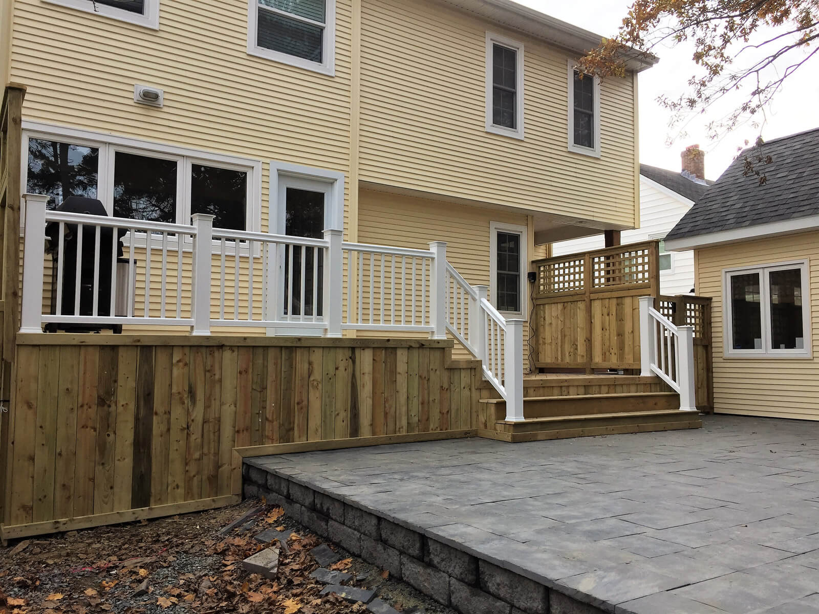 The new pressure treated wood deck extends along the back of the home and a flagstone patio was created below creating plenty of space for dining and entertaining. A new retaining wall and fence was installed to keep the property level and ensure proper drainage for their steeply-sloped yard. Design features like horizontal lattice and black, square cut pavers give the space clean lines and a modern feel to contrast the more traditional style of the home and natural wooded backyard.