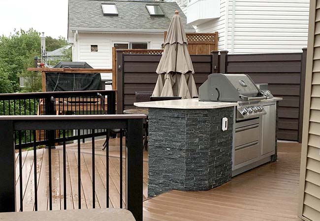 This unique thousand square foot design incorporates a large dining area and outdoor kitchen, hot tub area, and a spacious sitting area with gas fire feature. The built-in cooking area keeps all the mechanics hidden-away under the beautiful stone veneer panels. The new counter-top gives plenty of space for preparing and serving food.