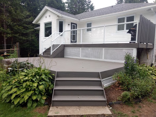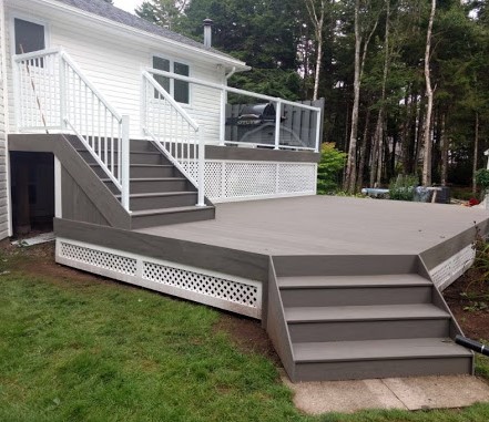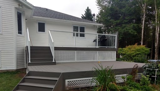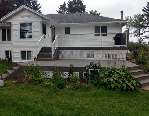 We supplied and installed low maintenance TimberTech Terrain composite decking on the lower deck, stairs, and bench. The Hammonds Plains homeowners chose a grey decking material.