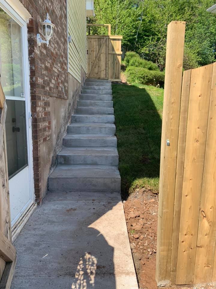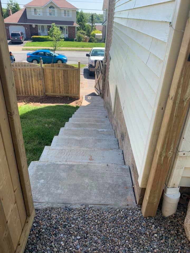 These Dartmouth homeowners needed new concrete stairs down the side of their home and landscaping including tree removal and stepping stones to upper yard! This project also included the supply and install of a new 72" high pressure treated solid board privacy fence!